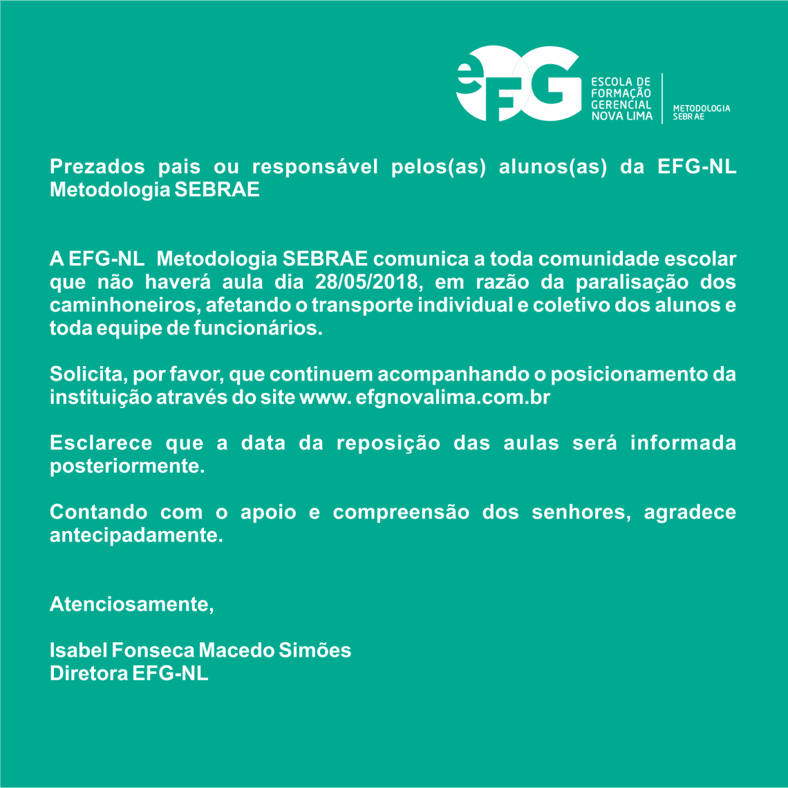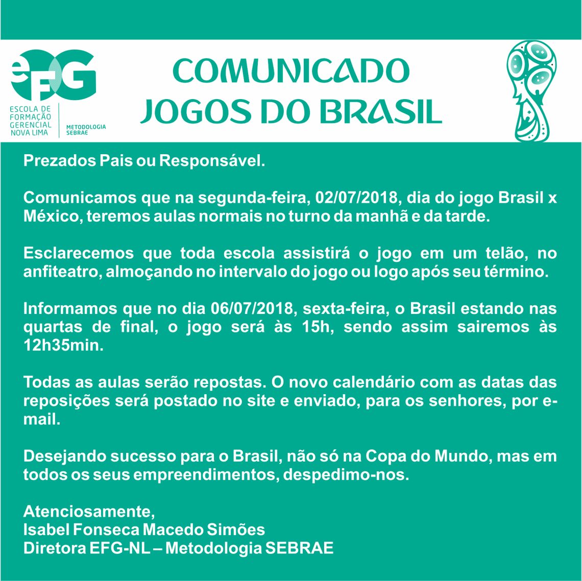 Comunicamos que na segunda-feira, 02/07/2018, dia do jogo Brasil x México, teremos aulas normais no